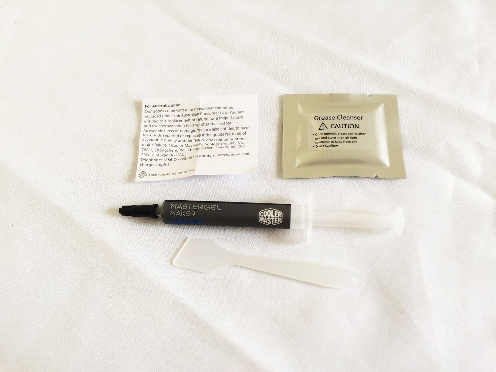 At the back of the package, you’ll find the specifications of the MasterGel Maker Nano, a plastic spreader, and a pack of alcohol swab to clean up the surface of your CPU before application.