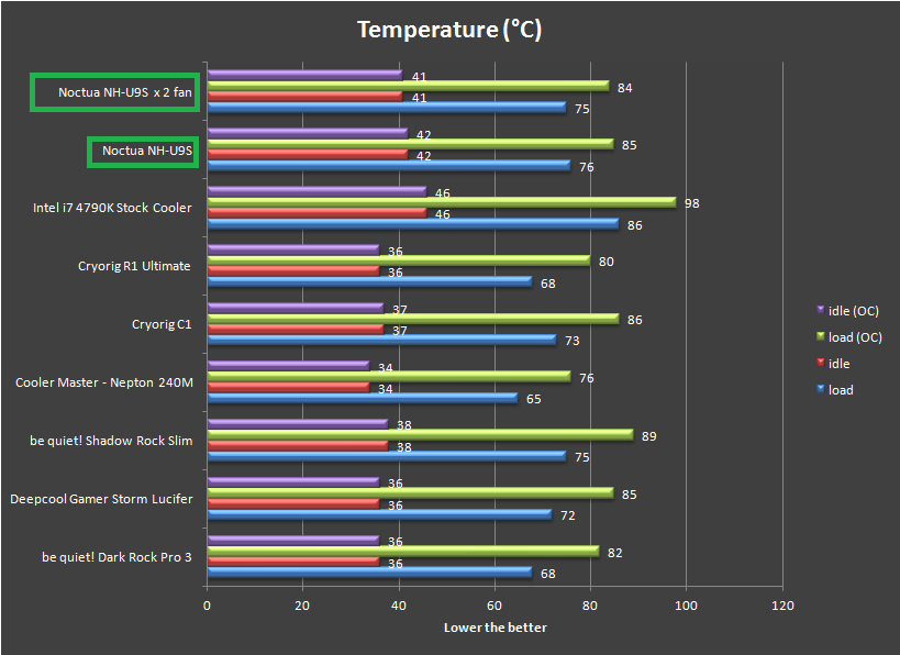 The results are very surprising indeed and honestly I found it hard to believe. Even though the idle temps are nothing to shout about, the load temps are amazing with the NH-U9S matching the NH-D14 and beating even the H100i from Corsair, truly incredible. Fan noise is very low and I’m glad to report that it’s hardly audible over my HD7850’s cooler fans even on load, they only run at about 1200RPM anyway.