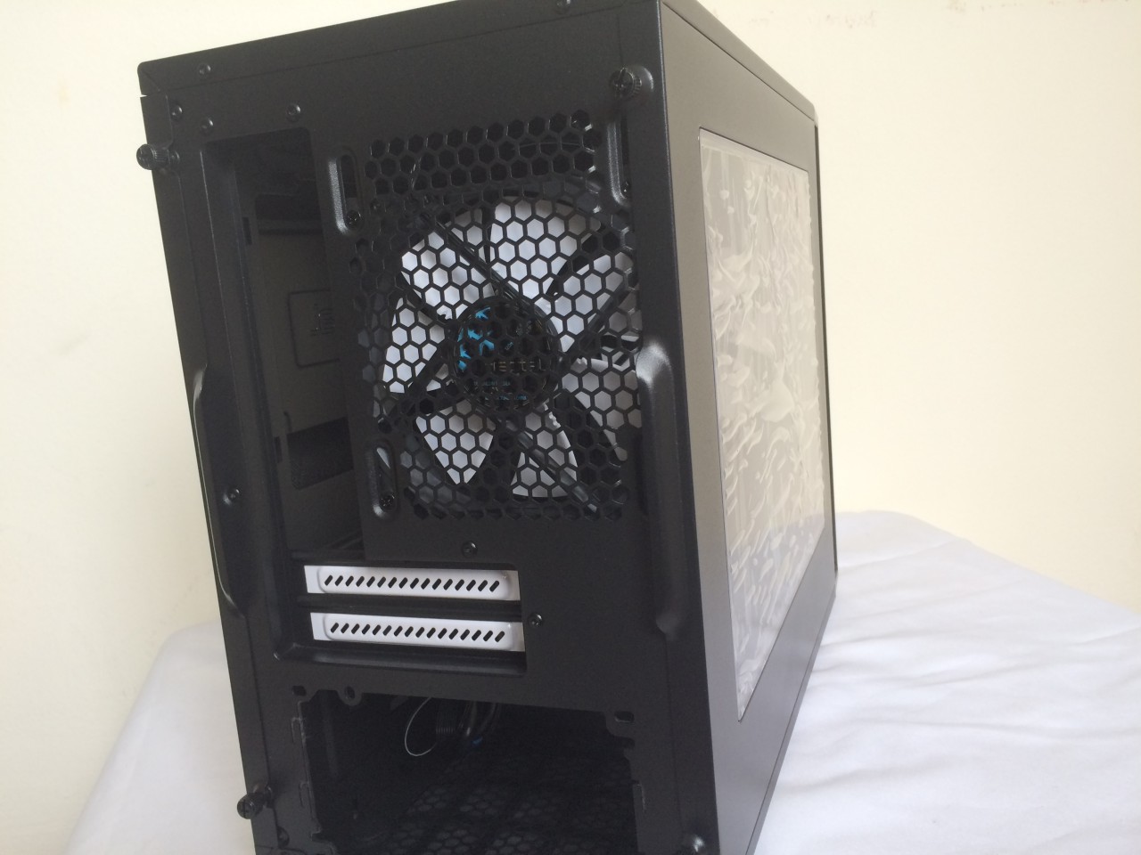 At the back of the case, you’ll find the lovable thumb screws, 2 x PCIe expansion slot and a 120mm case fan installed. The slidable fan mount is a good design that allows you to easily make space / clearance for a radiator at the top.