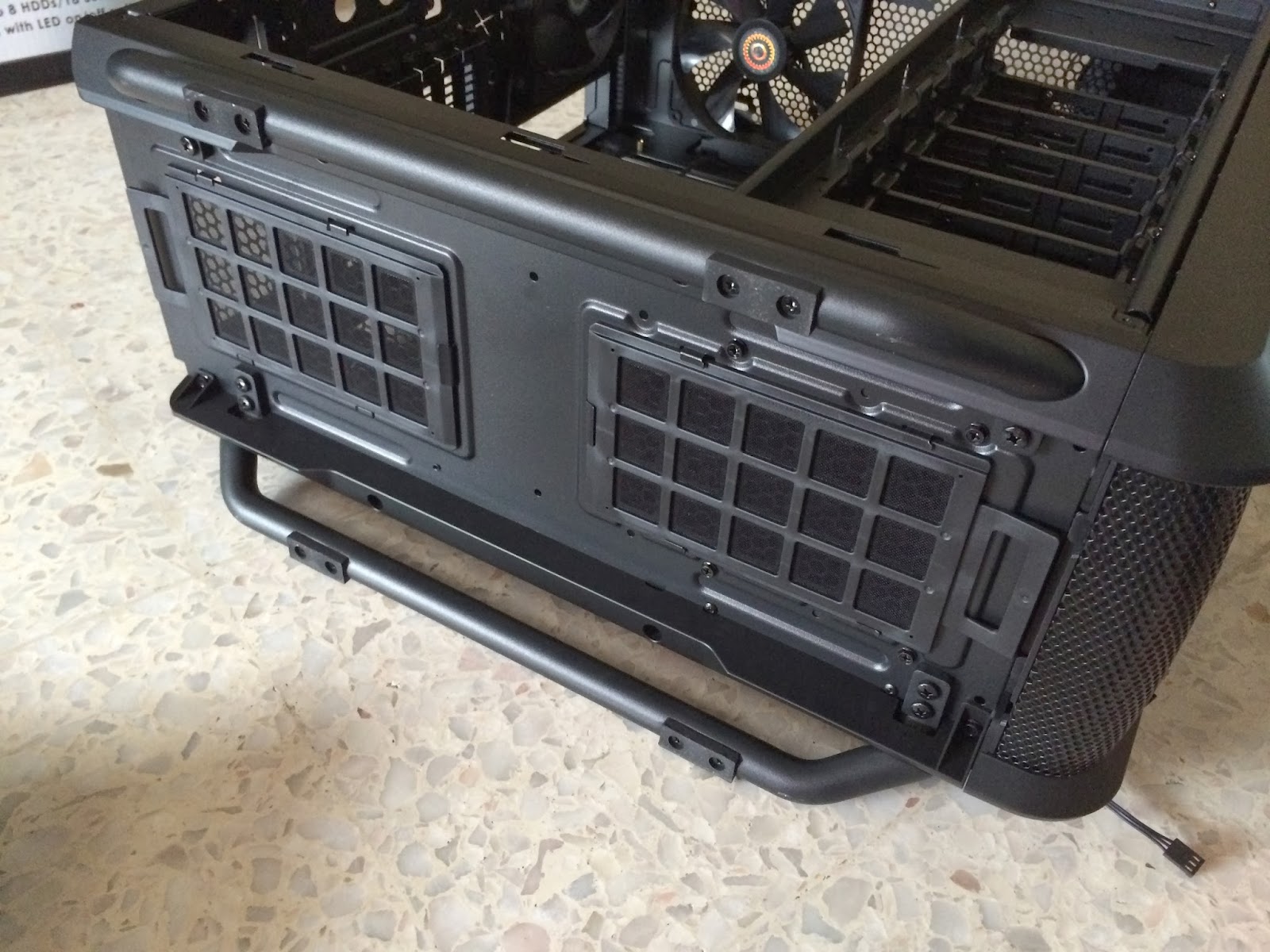 We’re now looking at the bottom of the Cosmos SE, the Cosmos series iconic curved metal bars that act as the case feet with rubber pads mounted as a cushion and two pieces of removable filters that helps letting fresh air in while keeping the dust out of your system.